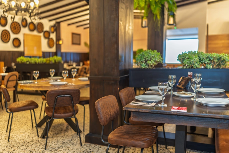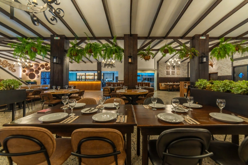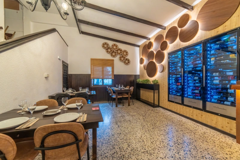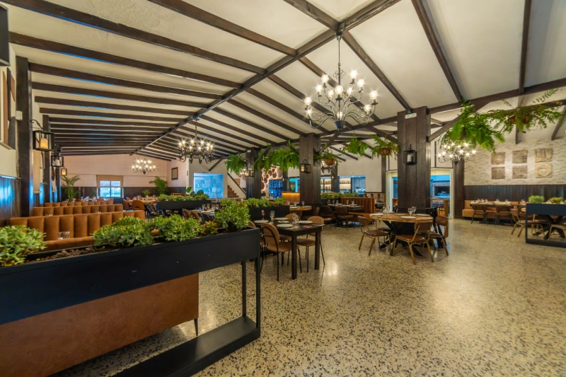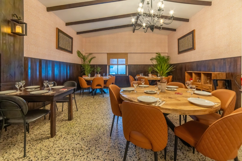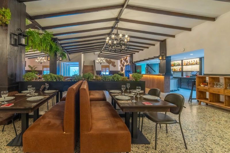 A lo largo del restaurante, el diseño va generando rincones especiales. Mesas más resguardadas, zonas más abiertas, bancos corridos, mesas redondas, separaciones vegetales… Cada área propone una forma distinta de sentarse y de vivir el espacio. Pasear por el restaurante es descubrirlo poco a poco, encontrar ese rincón donde apetece quedarse, donde la luz, los materiales y la disposición invitan a disfrutar sin prisas.