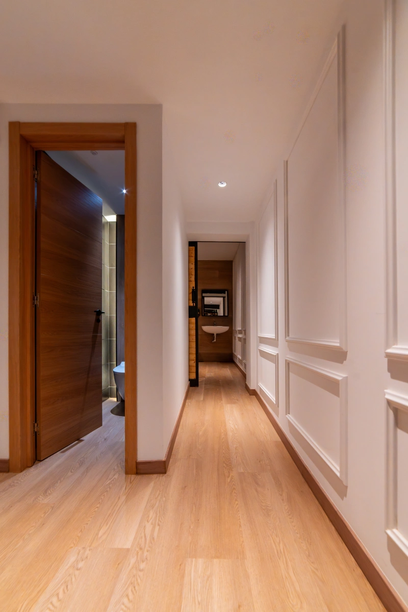 La madera oscura, especialmente el nogal, se convirtió en el hilo conductor del diseño. La utilicé en pilares, revestimientos, mobiliario y detalles, aportando profundidad, elegancia y una sensación envolvente que transforma por completo la percepción del espacio. Frente a la frialdad del estado original, la madera introduce calidez, peso visual y carácter. Es una madera que abraza, que arropa, que invita a quedarse.