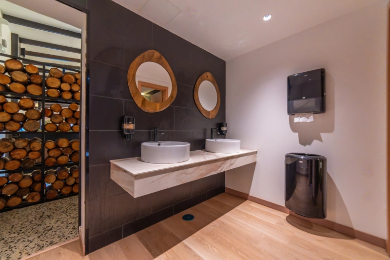 Los baños también fueron completamente reformados y pensados como una extensión más del diseño del restaurante. Los trabajé con el mismo cuidado y la misma coherencia estética que el resto del proyecto. Materiales nobles, iluminación cálida y una atmósfera envolvente hacen que incluso estos espacios transmitan calidad y atención al detalle. Porque un proyecto bien hecho se nota también en lo que normalmente no se ve.