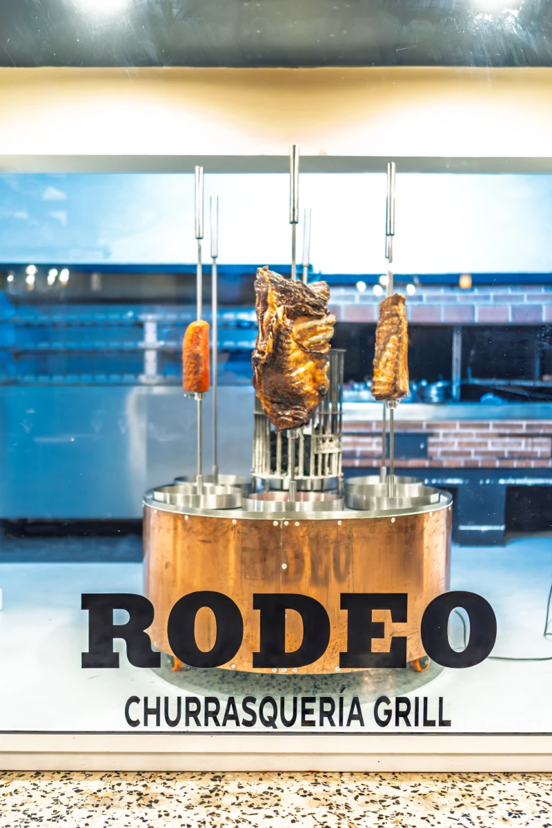 Uno de los grandes protagonistas del espacio es la urna de cristal del rodizio. La diseñé y fabriqué a medida como un auténtico escaparate de la esencia Rodeo. La carne, el proceso, el ritual del asado… todo queda a la vista. El cristal permite observar sin interferir, convirtiendo la cocina en parte del recorrido visual del cliente. Aquí, la gastronomía se muestra con orgullo, reforzando la experiencia y conectando directamente sala y cocina.